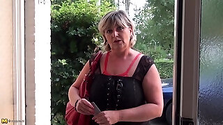 Stunning milf with huge melons gives solid blow-job to lucky neighbor