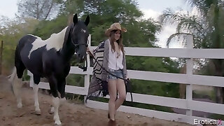 Splendid auburn haired cowgirl gobbles dick and fucked in the barn