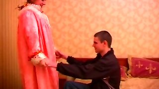 Mature plump russian female in tights & a young guy